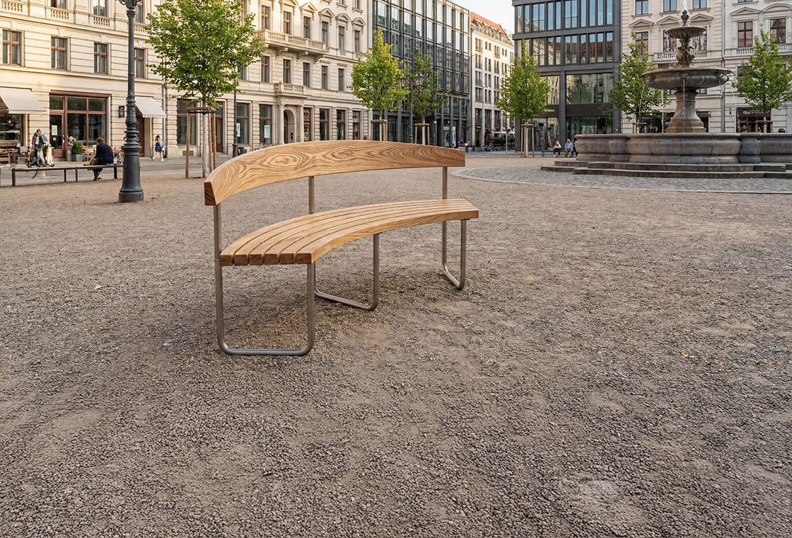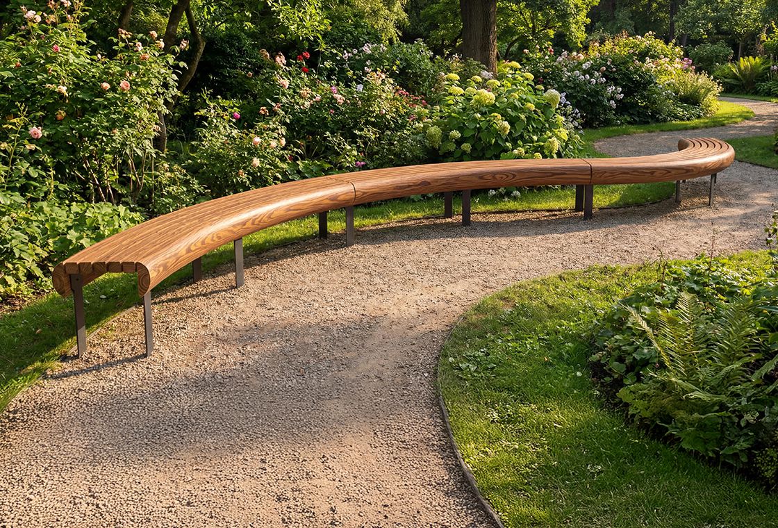 Garden furniture such as a bench from wood adds the finishing touch to a wide variety of settings – from furniture in the garden and parks to museums and restaurants to retirement homes and hospitals. Wood has become a hugely popular material for public furniture, including public benches and stool benches in parks and squares or at bus stops. Thanks to the natural flexibility of wood, a bench made of curved wood can be designed to blend in harmoniously with a building’s architecture or the surrounding landscape like a curved garden. In other words, a curved bench is always a good fit!